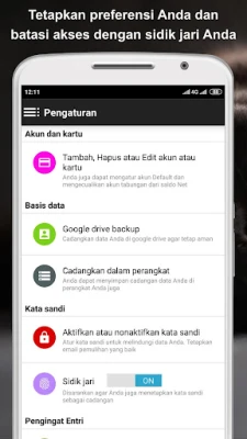 Keamanan data finansial Anda adalah prioritas utama. Aplikasi ini dilengkapi dengan perlindungan kata sandi yang kokoh, memastikan hanya Anda yang memiliki akses ke informasi pribadi Anda, dengan opsi pemulihan jika Anda lupa. Ketakutan kehilangan data? Tak perlu khawatir. Aplikasi ini secara otomatis mencadangkan database pengeluaran Anda setiap hari ke perangkat, dan Anda juga dapat memilih untuk mencadangkannya dengan aman ke Google Drive. Ini tidak hanya menjamin keamanan tetapi juga memungkinkan sinkronisasi data antar perangkat Anda. Kelola berbagai akun dan kartu sekaligus, dan lihat laporan terperinci untuk setiap sumber dana. Kategorikan pengeluaran favorit Anda untuk akses cepat dan pelaporan yang lebih fokus, memberikan Anda kendali penuh atas setiap aspek keuangan. Bagikan laporan penting dengan mudah melalui Email, WhatsApp, Google Drive, atau Dropbox.